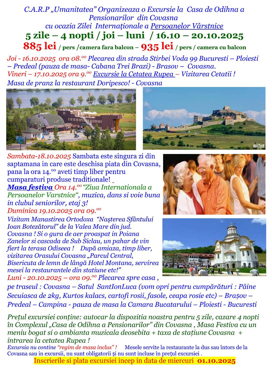 EXCURSIE ZIUA PENSIONARILOR 16.10 - 20.10.2025